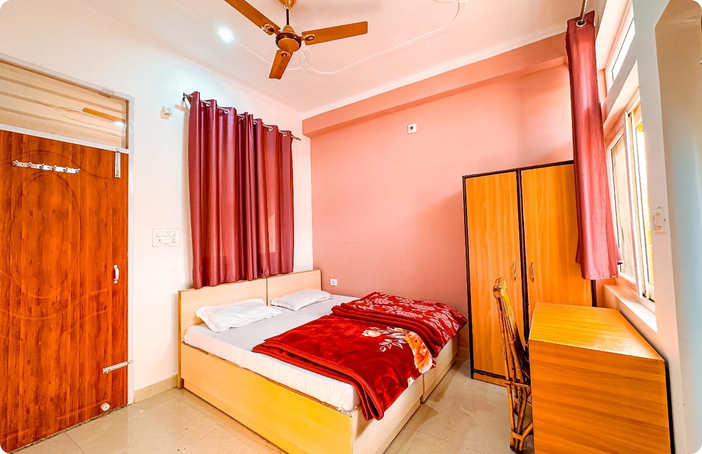 Every room is clean, airy, and filled with natural light. You’ll find cozy beds, fresh linens, attached bathrooms with hot water, and all the basics you need to feel at home. Whether you choose a private room or a shared one, the feeling is the same peace.